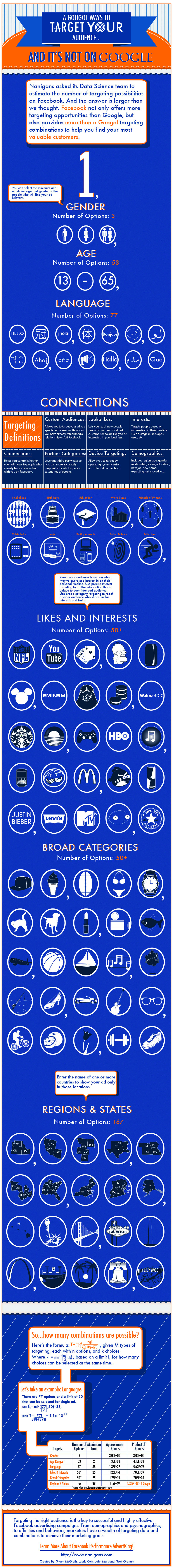 According to Venture Beat – there are a Googol number of ways to target ads on Facebook. A Googol is 1 with 100 zeros after it (1 x 10^100).
